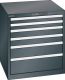 Schubladenschrank: Gehäuse: Aussenmass B x T x H: 717 x 725 x 800 mm, Lichte Höhe: 700 mm, Farbe Korpus: Schwarz, NCS S 9000-N, Lackierung: Schlag- und abriebfeste Oberfläche durch umweltfreundlichen Pulverlack, Material: Sehr hohe Belastbarkeit durch präzise und stabile Konstruktion aus hochwertigem, geschweisstem Stahlblech; Schliessung: Art: Key Lock (verschiedenschliessend) mit Zentralverschluss und Wechsel-Zylinder inkl. 2 Schlüssel mit Schlüsselnummer; Schubladen: Lista-Einheit: 36 x 36 E, Nutzmass B x T: 612 x 612 mm, Anzahl gesamt: 6, Anordnung Fronthöhen / Nutzhöhen (Tragkraft je Schublade): siehe Datenblatt, Auszugart: Vollauszug, Sicherungsart: Standard, Farbe Fronten: Schwarz, NCS S 9000-N, Lackierung innen: Vollumfänglicher Korrosionsschutz durch Elektrophorese-Tauchlackierung, Taubengrau, NCS S4502-B, Material Schubladen: Sehr hohe Belastbarkeit durch präzise und stabile Konstruktion aus hochwertigem, geschweisstem Stahlblech;